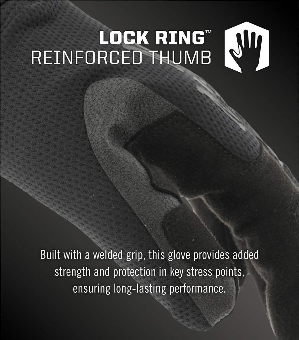 - Specially reinforced thumb and index finger panels increase durability for demanding tasks.